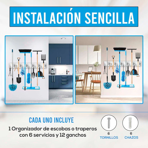 2 Organizadores de escobas cada uno con 6 servicios, 12 ganchos, 6 tornillos y 6 chazos.