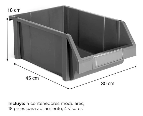 Aumenta la eficiencia de tu almacenamiento con nuestro exclusivo set de 4 Modulares Abiertos AZ, diseñados individualmente para cargar hasta 45 Kg. Fabricados con polipropileno destinado a soportar las demandas del trabajo pesado, estos organizadores modulares ofrecen una solución robusta y duradera para manejar intensivamente el picking y organizar grandes inventarios. Cada uno con medidas de 45cm de largo, 30cm de ancho y 18cm de alto, garantizan un aprovechamiento óptimo del espacio, permitiendo una capacidad de apilamiento seguro de hasta 500 Kg.