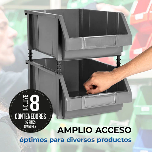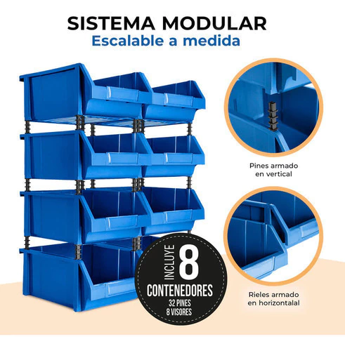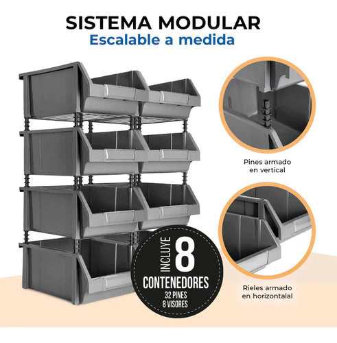 Eleva la organización de tu entorno con nuestro set de 8 modulares. Su durabilidad, capacidad y diseño facilitan una gestión del espacio más efectiva. Adquiere tu set hoy y experimenta una mejora notable en la organización y accesibilidad de tu inventario.