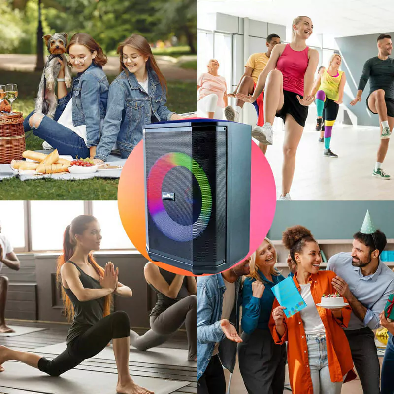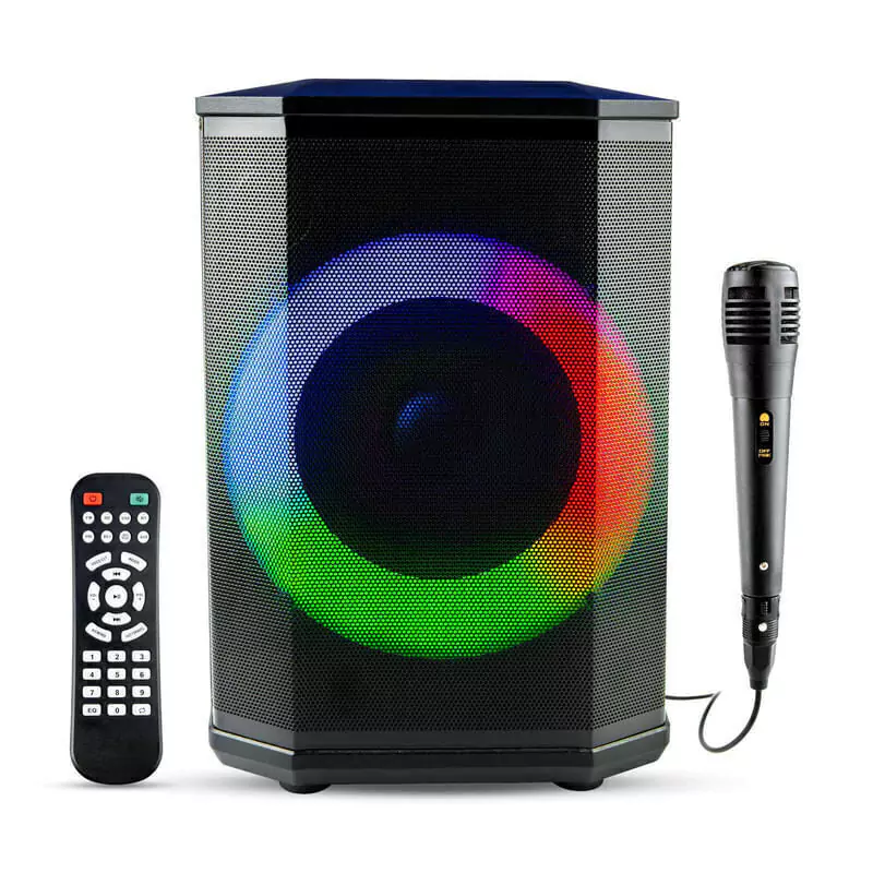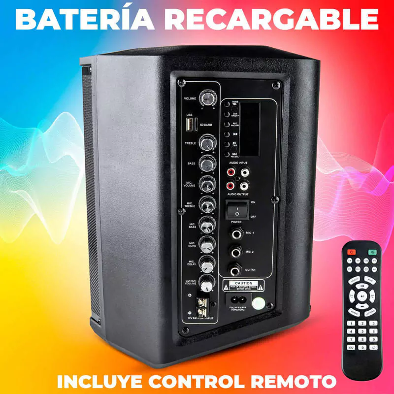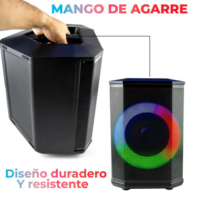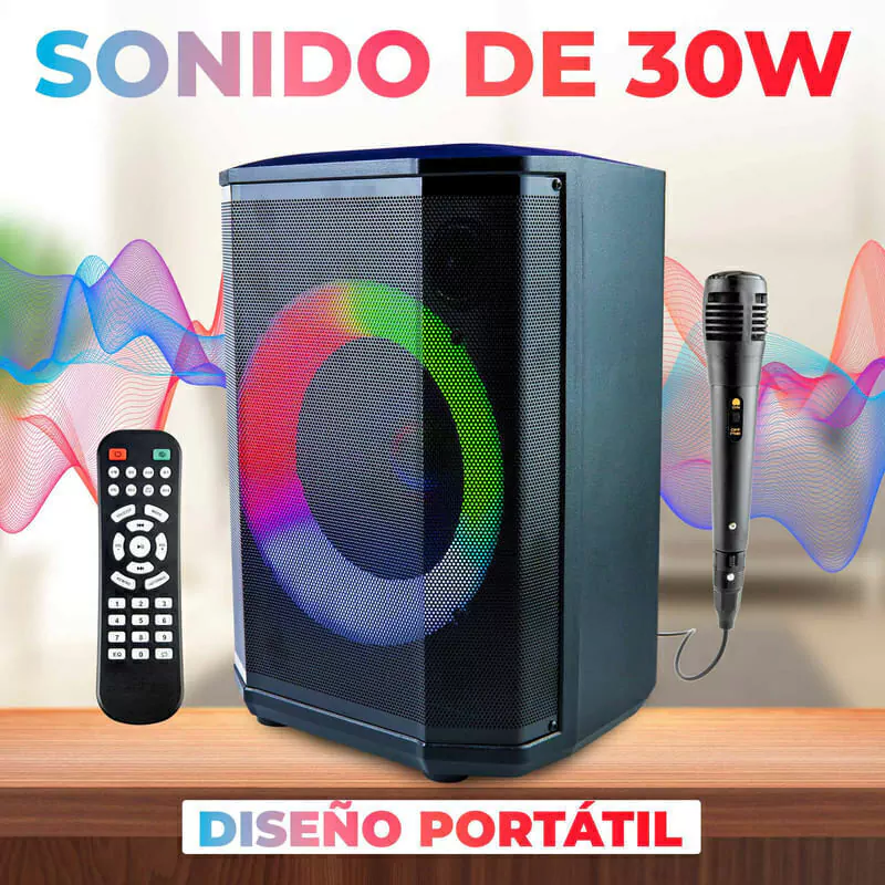 Lleva tus celebraciones al siguiente nivel con el Bafle 8" 30W Recargable con Radio, Micrófono y LED RGB. ¡Disfruta de un sonido espectacular, múltiples funciones y un ambiente lleno de color en cualquier lugar y momento!