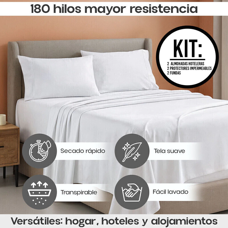 Combo Descanso Premium: 2 Almohadas Hotelera + 2 Protectores Antifluido Microfibra + 2 Fundas 180 Hilos Blanca