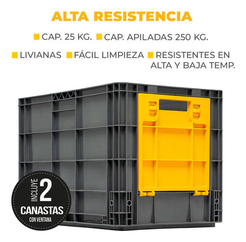 - Optimización del Espacio: Cada canasta puede soportar hasta 25 kg y se puede apilar hasta 250 kg, permitiéndote maximizar el uso del espacio vertical.