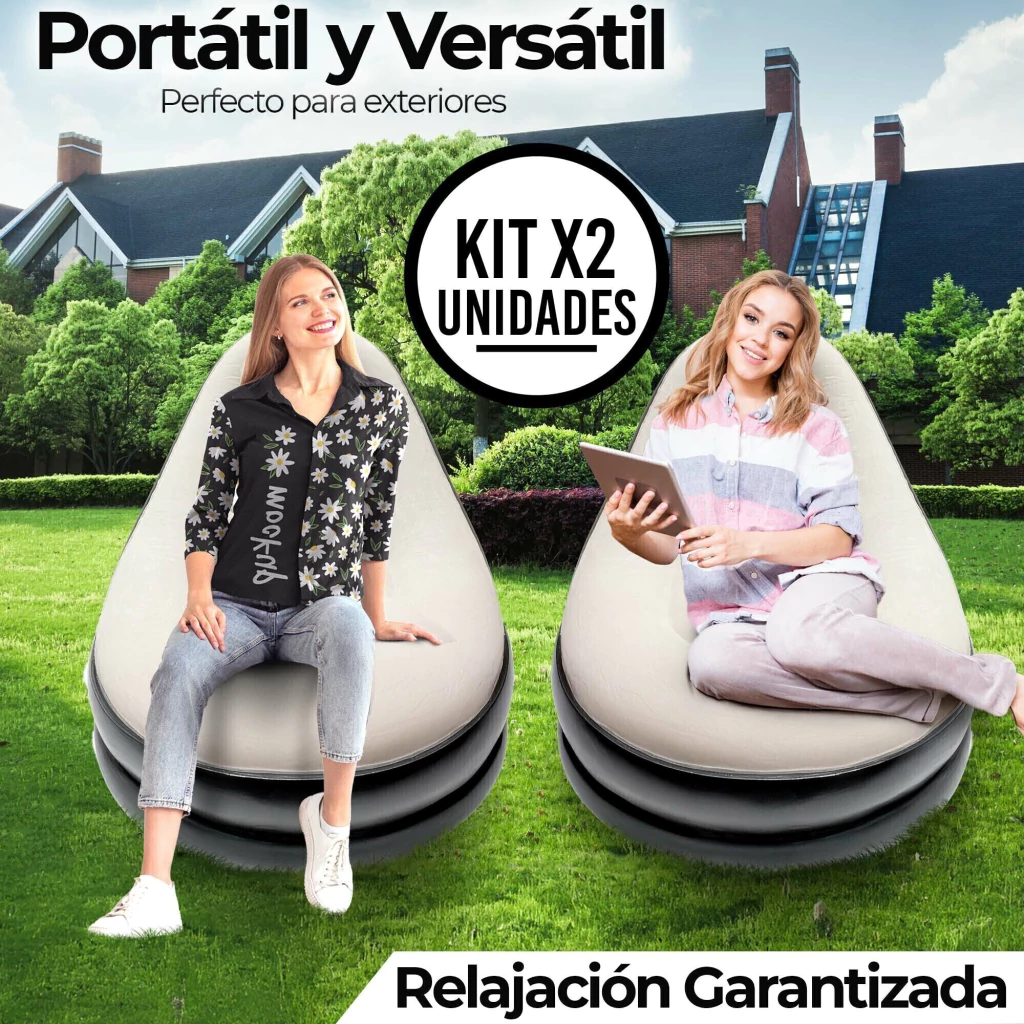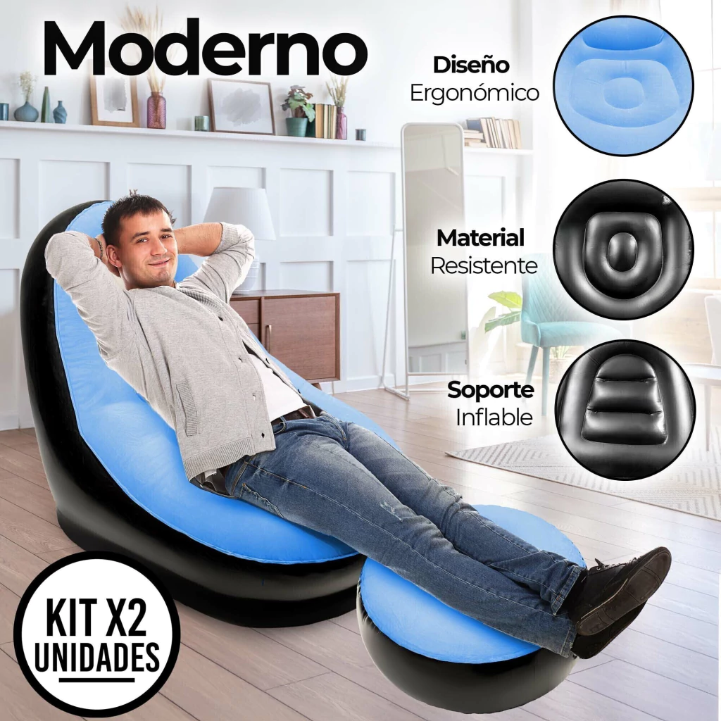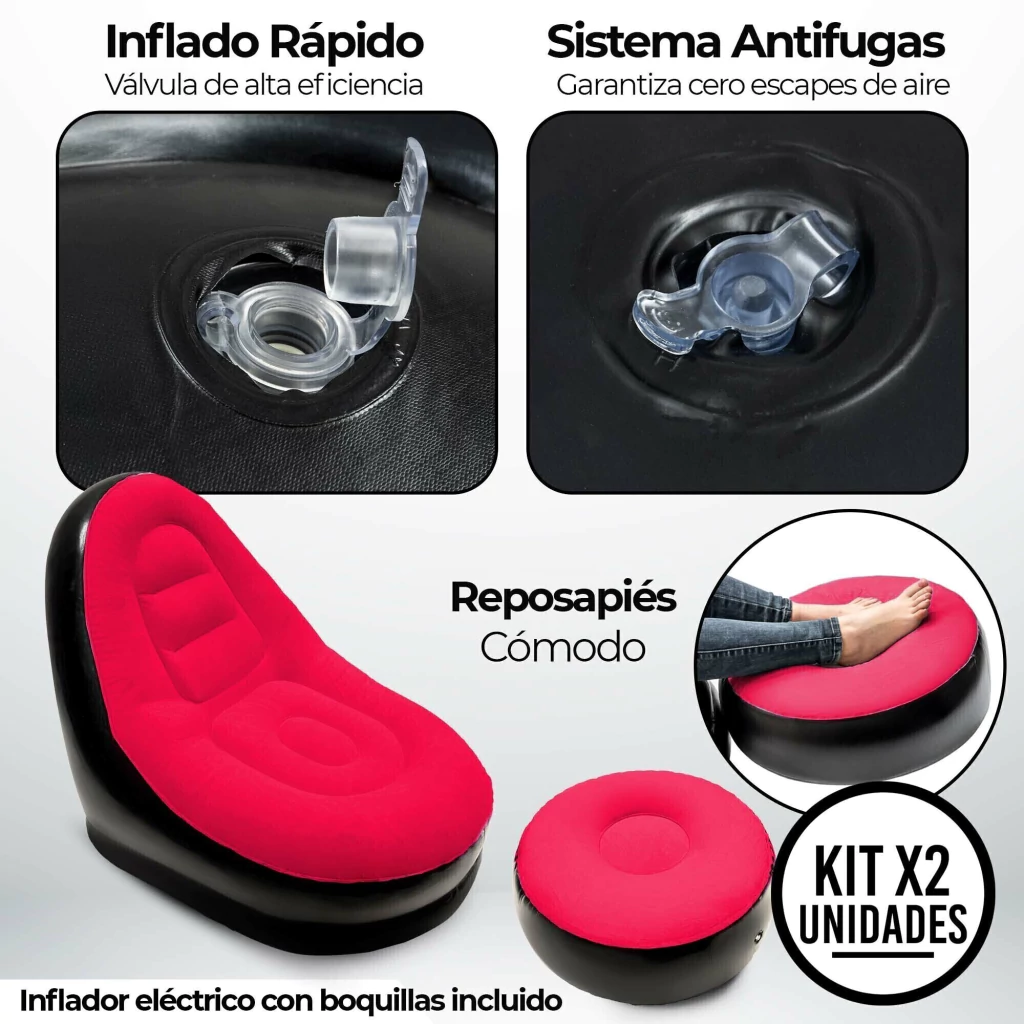 El Set x2 Sofás Inflables Portátiles con Reposapiés e Inflador Eléctrico es la solución perfecta para momentos de relajación en cualquier lugar. ¡No dejes pasar esta oportunidad y adquiere este práctico set para disfrutar del confort a otro nivel! ¡Compra ahora!