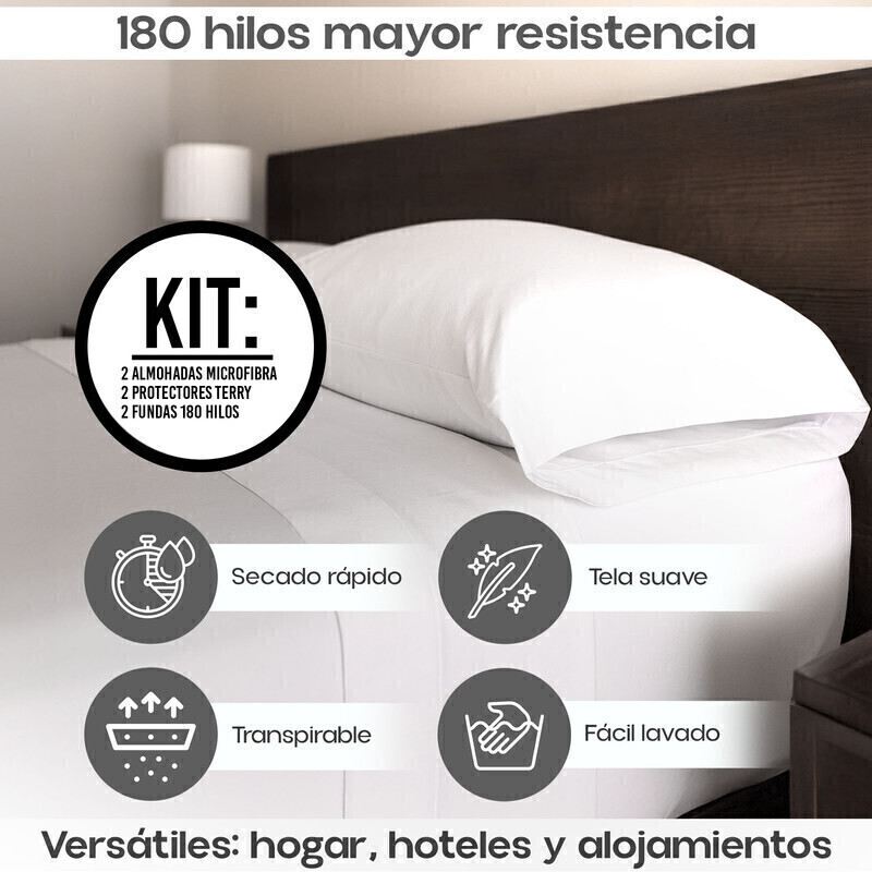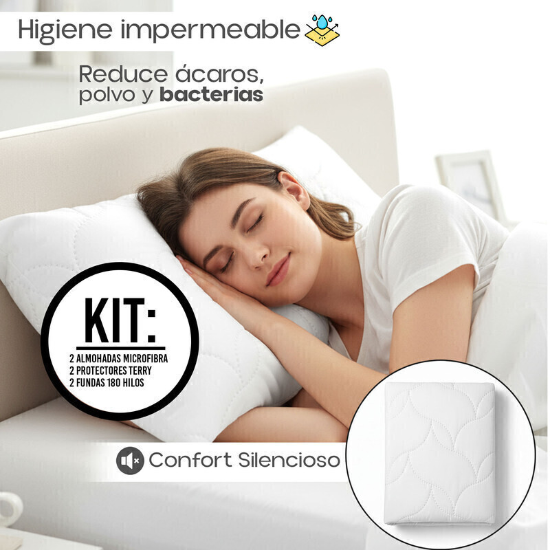 Combo Hotel King: 2 Almohadas Fibra Siliconada 90x50 + 2 Protectores Antifluido Microfibra + 2 Fundas 180 Hilos