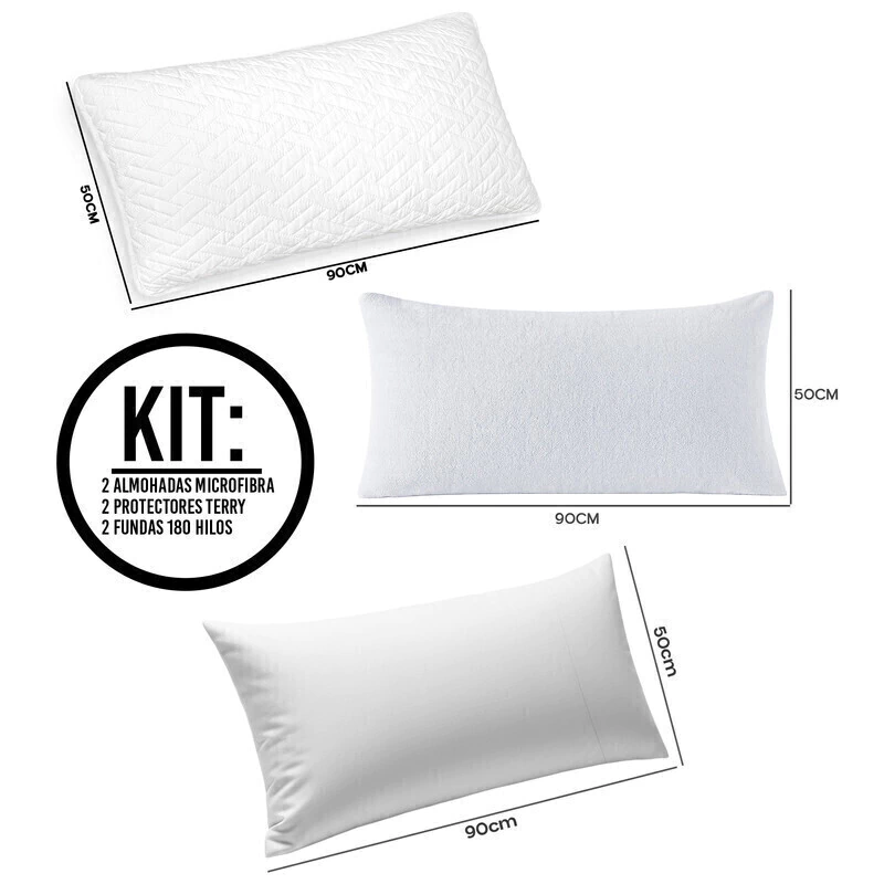 Combo King Premium: 2 Almohadas Fibra Siliconada + 2 Protectores Impermeables Algodón Rizo + 2 Fundas 180 Hilos (90x50 cm)