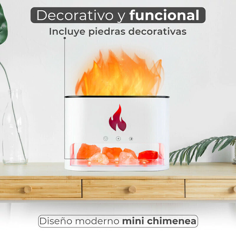 - Efecto Visual Único: Su simulación de llama con luces LED ajustables (amarillo, rojo, verde y azul) añade un toque moderno y elegante.