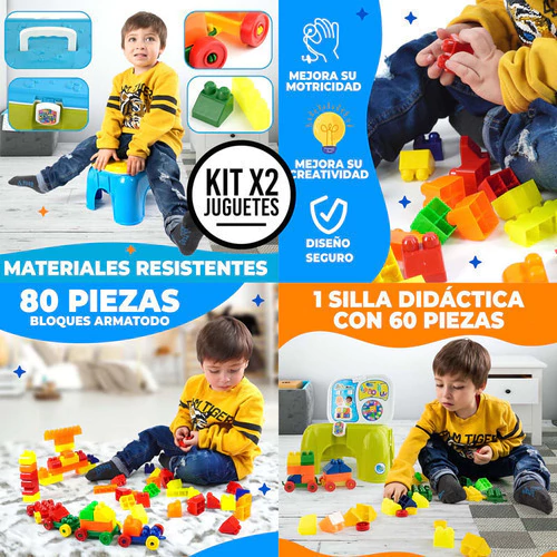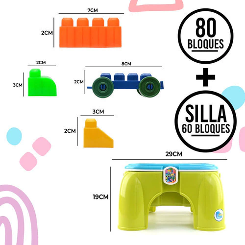 ¡Anima a tus pequeños a sumergirse en el mundo del aprendizaje y la diversión con nuestro Combo de Juguetes Didácticos: Bloques x80 + Silla Aprendizaje 66 Pzas! Este conjunto único está diseñado para desatar la creatividad y promover el desarrollo cognitivo de los niños, proporcionando herramientas ideales para el aprendizaje lúdico. Fabricados con Polipropileno de alta calidad, estos juguetes son seguros y duraderos, ideales para las manitas curiosas de tus hijos.