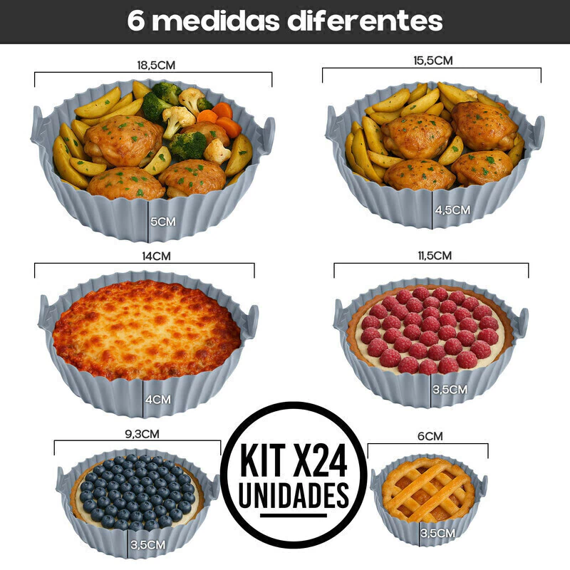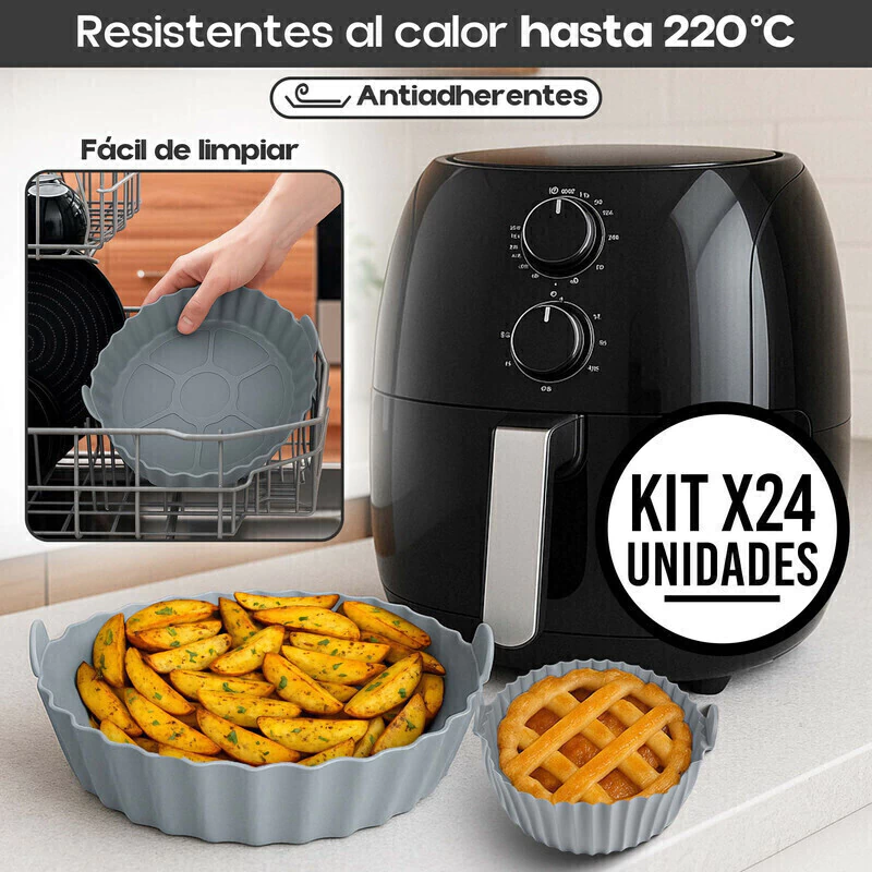 Cocina fácil, rápido y sin ensuciar tu freidora con el Kit x 24 Moldes Silicona para Freidora de Aire Reutilizables. Perfectos para todo tipo de recetas, desde papitas crocantes hasta postres deliciosos, estos moldes protegen tu freidora y te facilitan la limpieza.