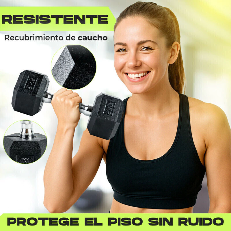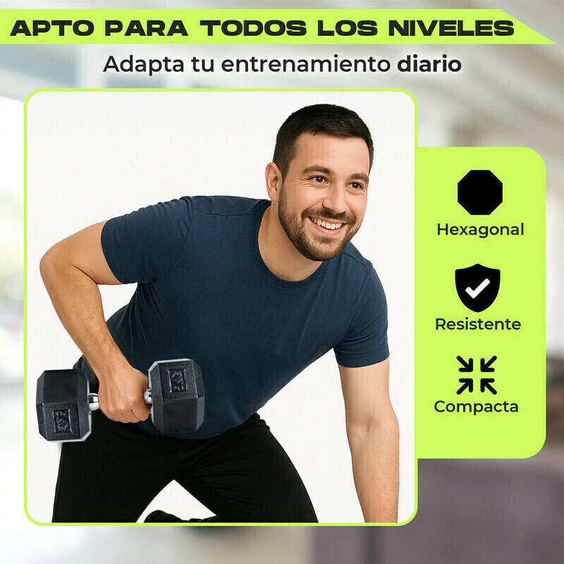 - Diseño hexagonal que evita que ruede, aportando estabilidad y seguridad durante el entrenamiento.