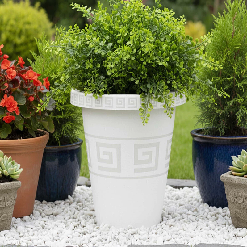 Su forma cónica, acabados modernos y color neutro la hacen perfecta para decorar interiores amplios, balcones, terrazas o jardines exteriores. Fabricada en polietileno, esta matera es liviana, resistente al sol, al agua y al uso continuo, lo que garantiza durabilidad y practicidad.