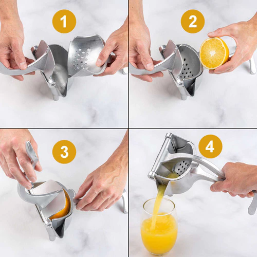 Este exprimidor manual de frutas en aluminio es una excelente elección. ¡Disfruta de tus jugos recién exprimidos con facilidad y rapidez!