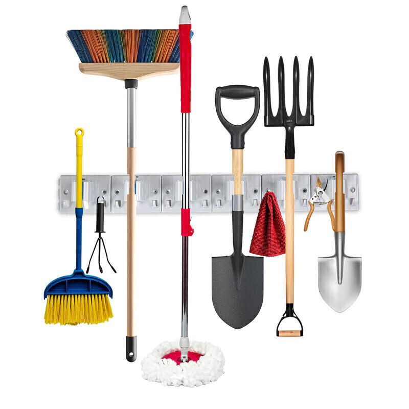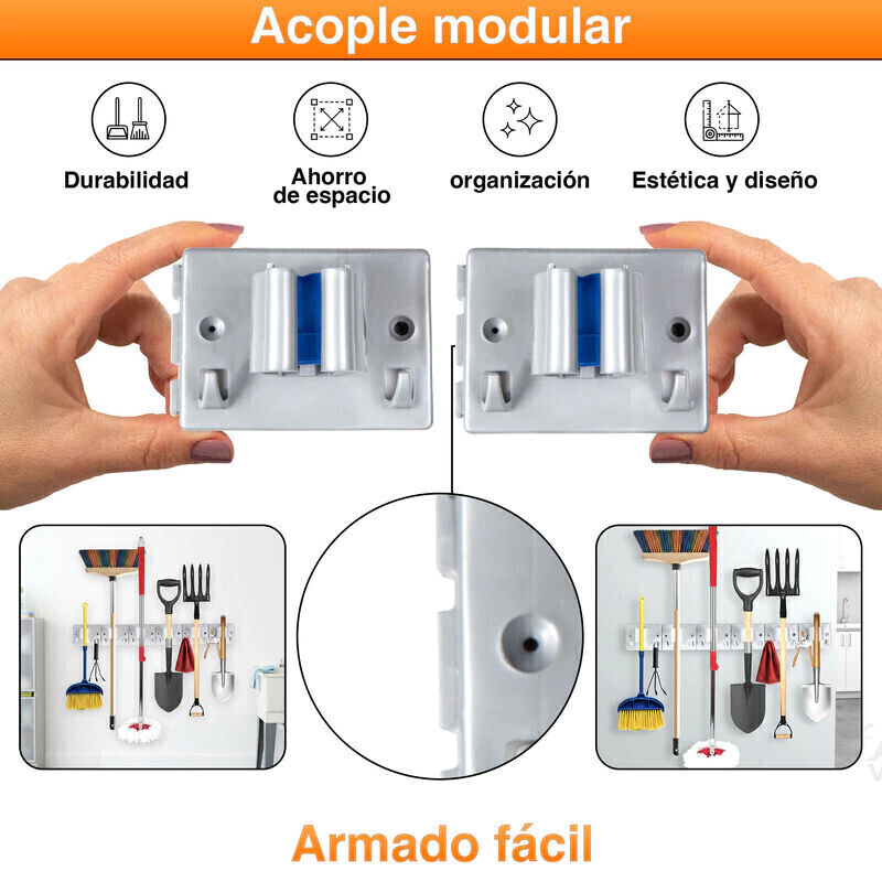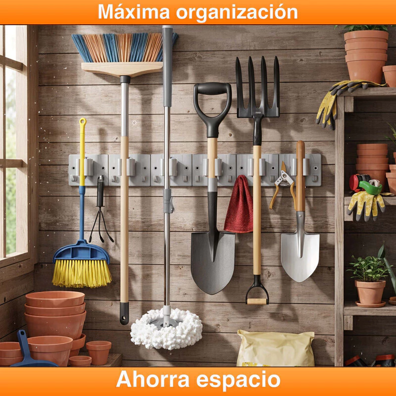 Mantén todos tus utensilios de limpieza y herramientas en perfecto orden con el Portaescobas y Traperos a Presión Multisoporte x6 con 12 Ganchos. Su diseño amplio te permite organizar escobas, traperos, palas, trapeadores y hasta accesorios de jardín de forma práctica y segura. El sistema a presión sujeta cada mango sin dañarlo y evita que se caigan.