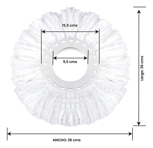 El diametro total de la mopa es de 36 cms, el interior de la rueda tiene un diametro de 9,5 cms y el exterior de la rueda mide 15,5 cms.