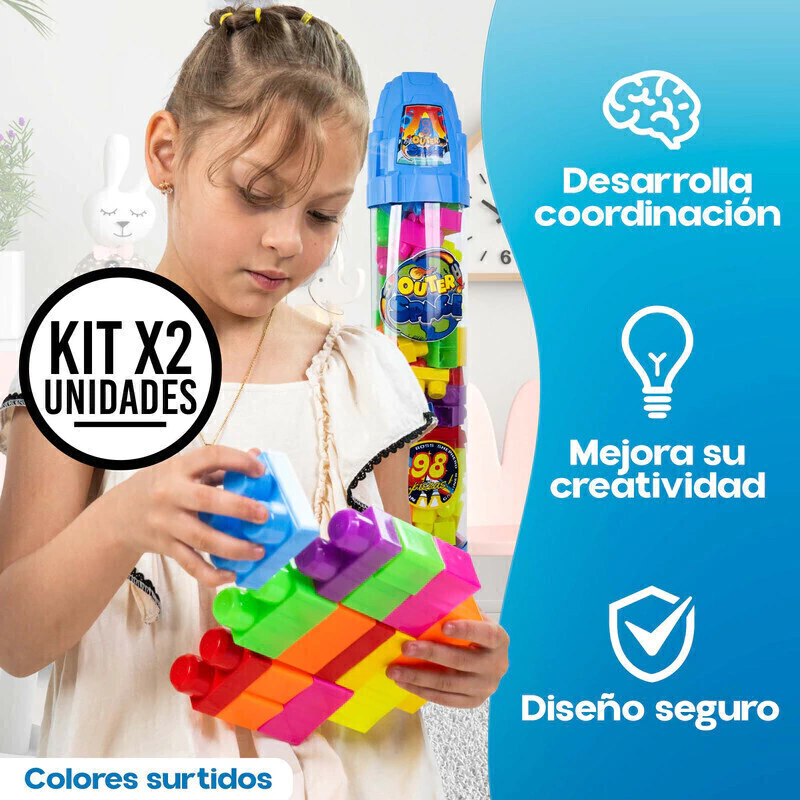 2 sets de bloques de construcción, cada uno con 98 piezas coloridas y resistentes en un envase en forma de cohete.