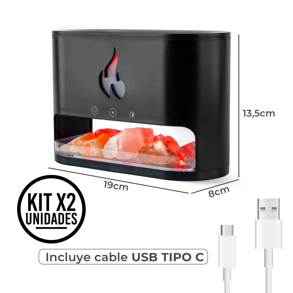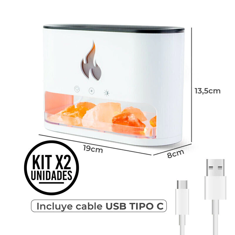 - 2 Humidificadores y Difusores de Aromas con Efecto Llama y Luces LED, cada uno con accesorios decorativos como piedras para ambientar y cable de carga USB tipo C.