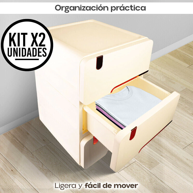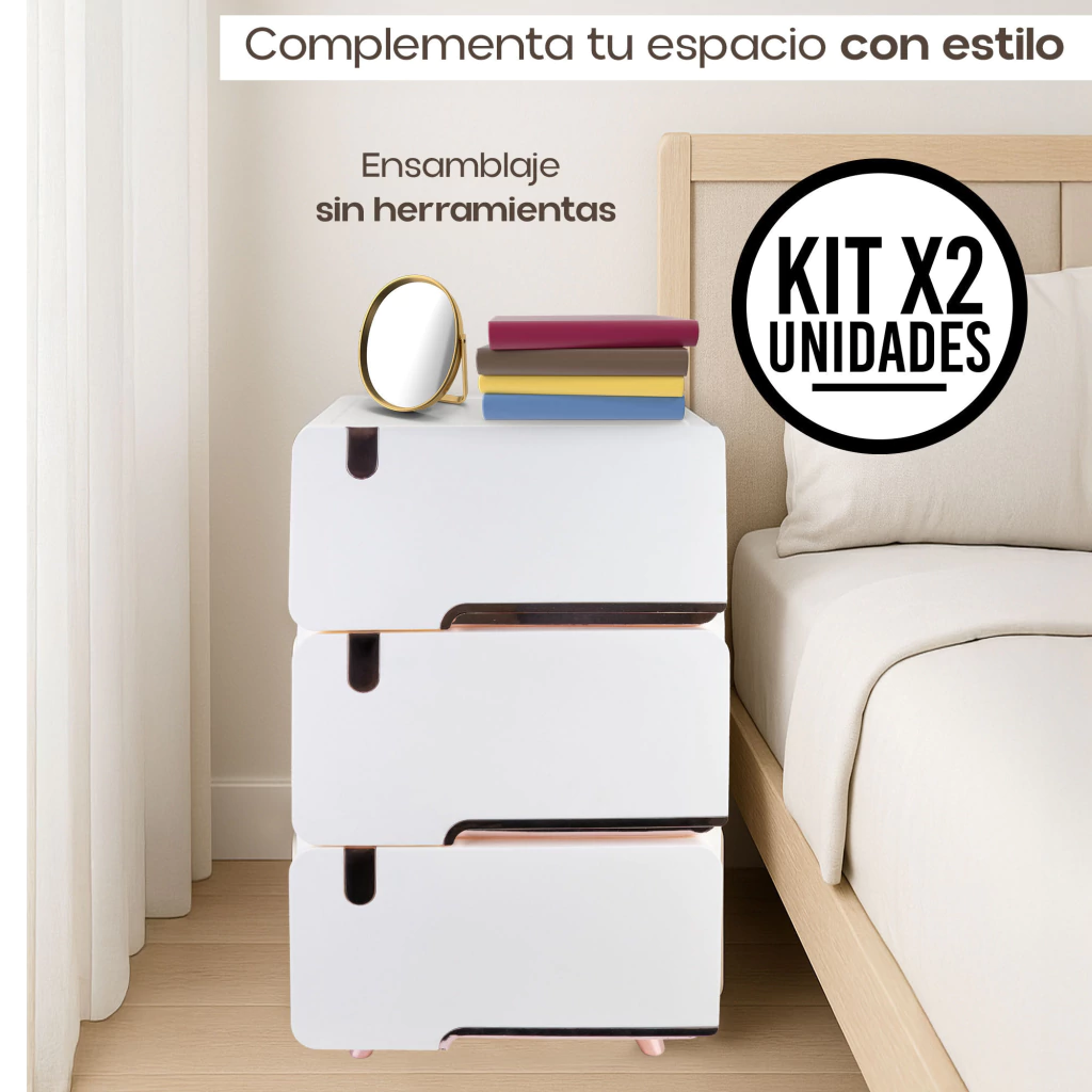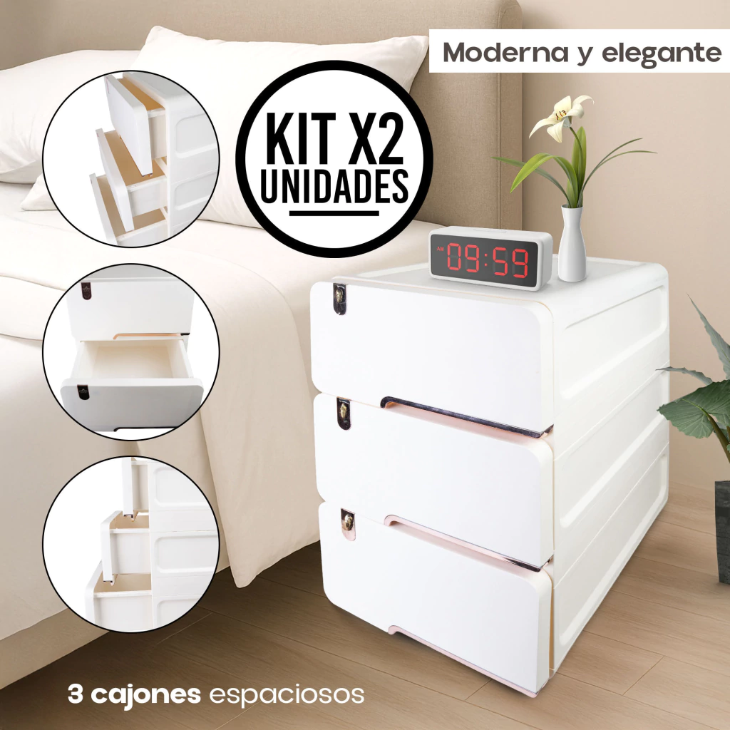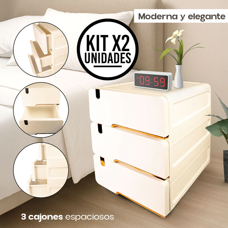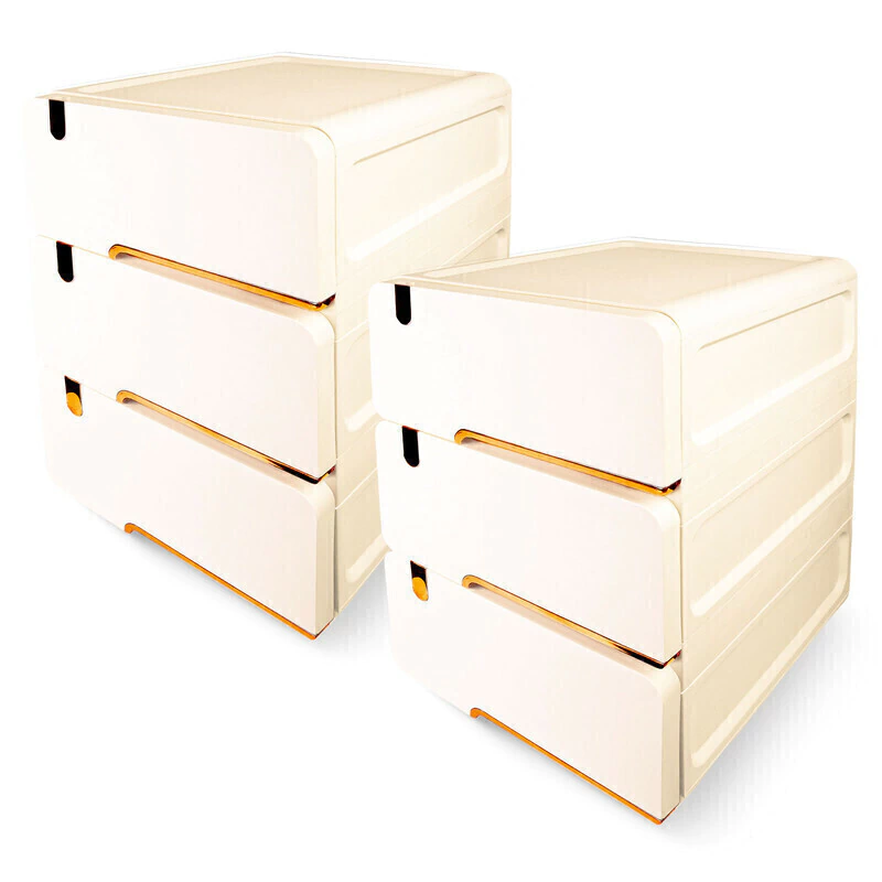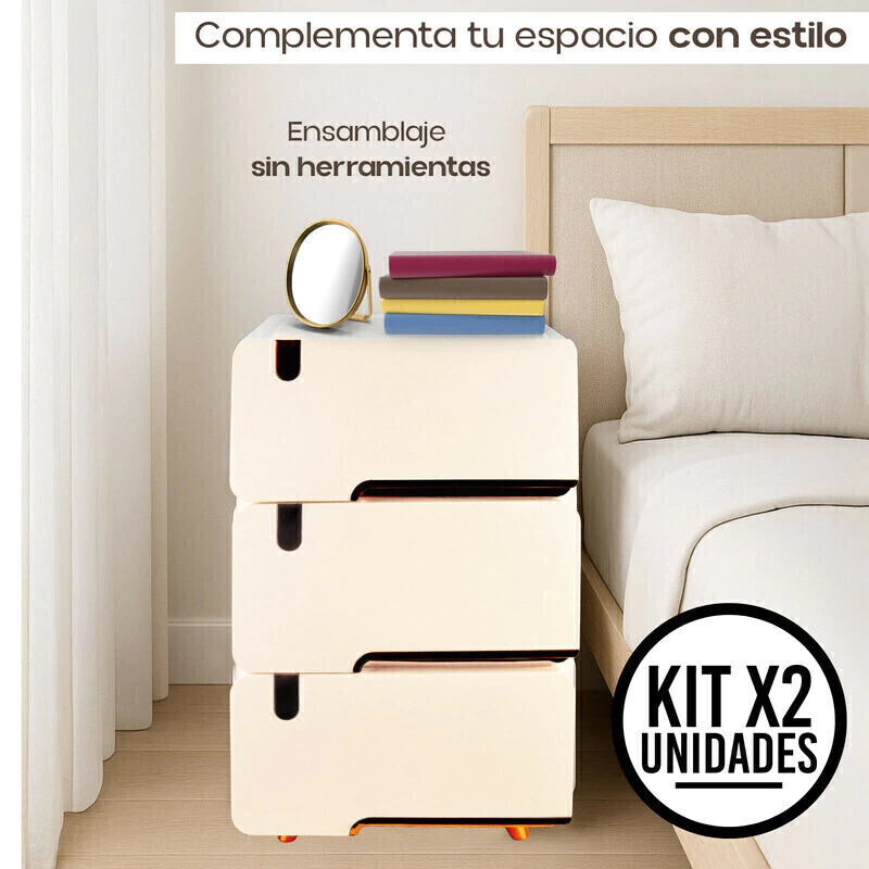 Set x2 Mesas de Noche Beige de 3 Cajones Moderna Plástico Resistente: