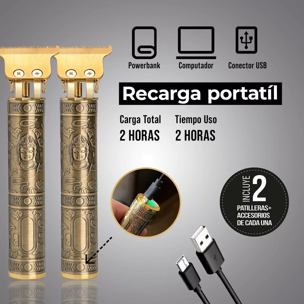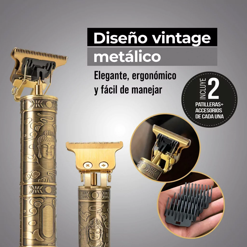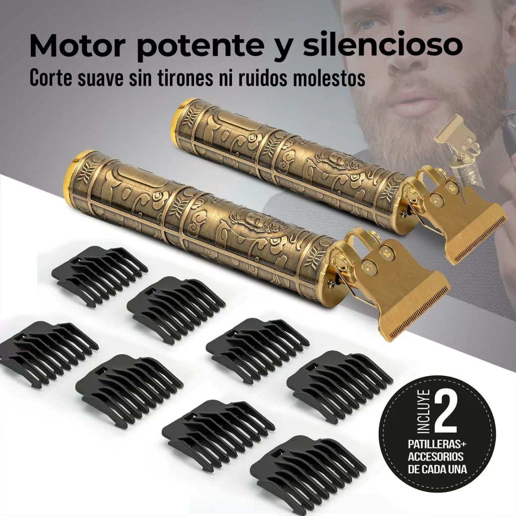 ¡Duplica la precisión y el estilo con este set de 2 Patilleras Vintage Recargables! Diseñadas para ofrecer cortes y acabados profesionales, estas patilleras cuentan con una cuchilla en T de precisión, un potente motor silencioso y un diseño vintage metálico que brinda elegancia y comodidad. Ideales para delineados, cortes de cabello y detalles en barba, garantizan un rendimiento excepcional para cualquier estilo.