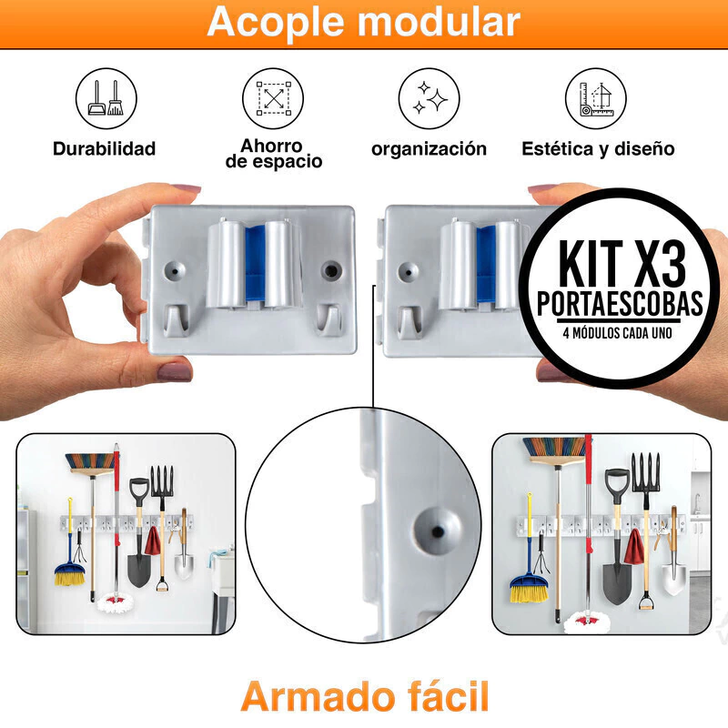 Este combo incluye 3 porta escobas colgadores a presión, y cada uno contiene: