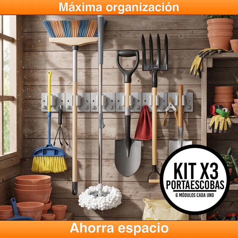 Lleva tu organización al siguiente nivel con este set triple de portaescobas multisoporte a presión. Cada unidad ofrece 6 sujetadores firmes y antideslizantes más 12 ganchos incluidos, ideales para colgar escobas, traperos, palas, trapeadores, herramientas o accesorios de jardín. Su diseño robusto y práctico aprovecha el espacio en pared y mantiene todo en orden, sin objetos en el piso.