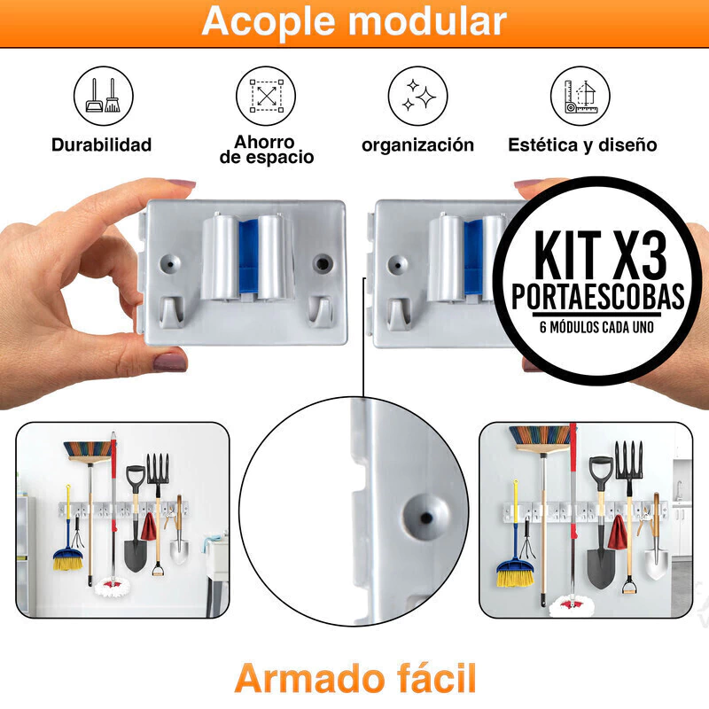 Este combo incluye 3 portaescobas colgadores a presión, y cada uno contiene: