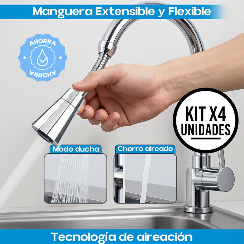 ¡Cuatro veces más practicidad y ahorro para tu cocina! Con el Set x4 Grifo Manguera Extensible Flexible Ahorrador de Agua para Cocina, equipas tus espacios con máxima funcionalidad. Cada grifo cuenta con una manguera flexible y extensible que te permite dirigir el agua con precisión, facilitando la limpieza de utensilios, frutas, verduras o el llenado de recipientes grandes. Además, su sistema ahorrador reduce el consumo de agua sin perder potencia, combinando eficiencia y modernidad en cada uso.