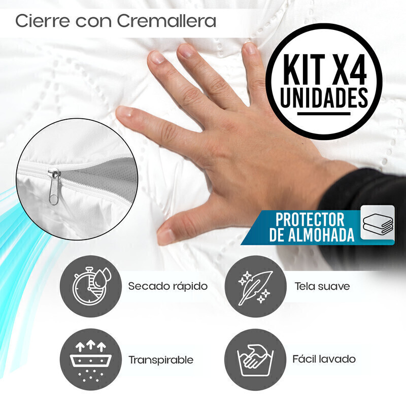 ¡Cuida lo que acompaña tu descanso cada noche! Con este set de 4 protectores antifluidos, mantén tus almohadas siempre limpias, frescas y protegidas. ¡Adquiérelo ahora y dale a tu hogar un toque extra de higiene y confort!