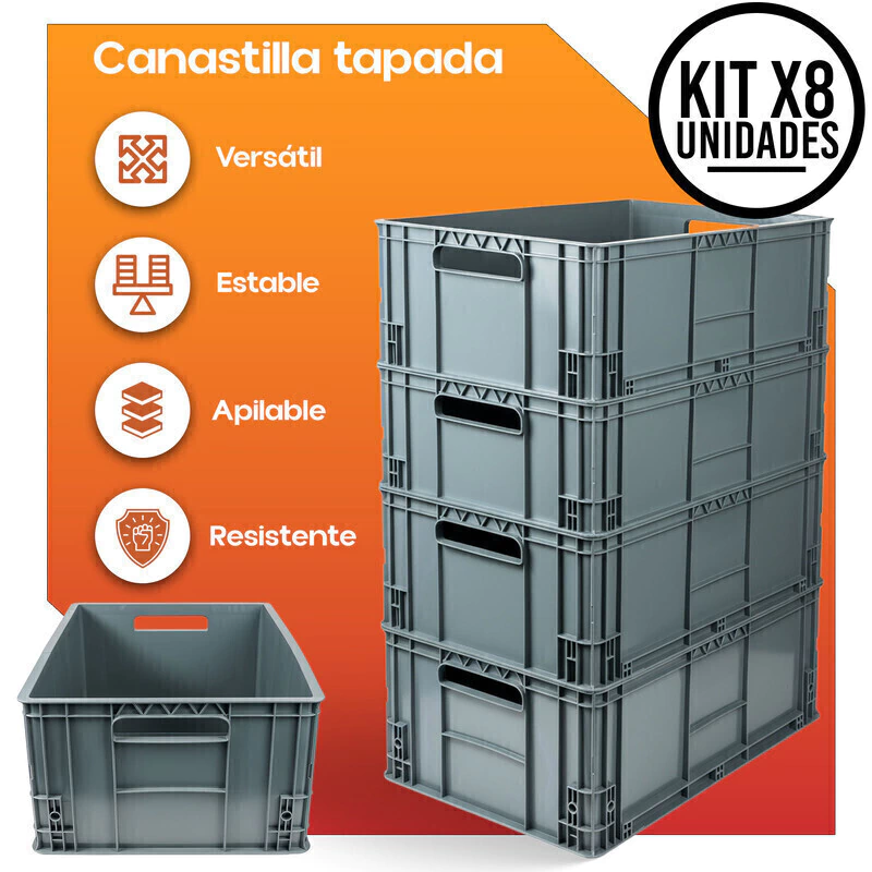Set x8 Canastillas Plásticas Tapadas 60x40x25cm Apilables Industriales.